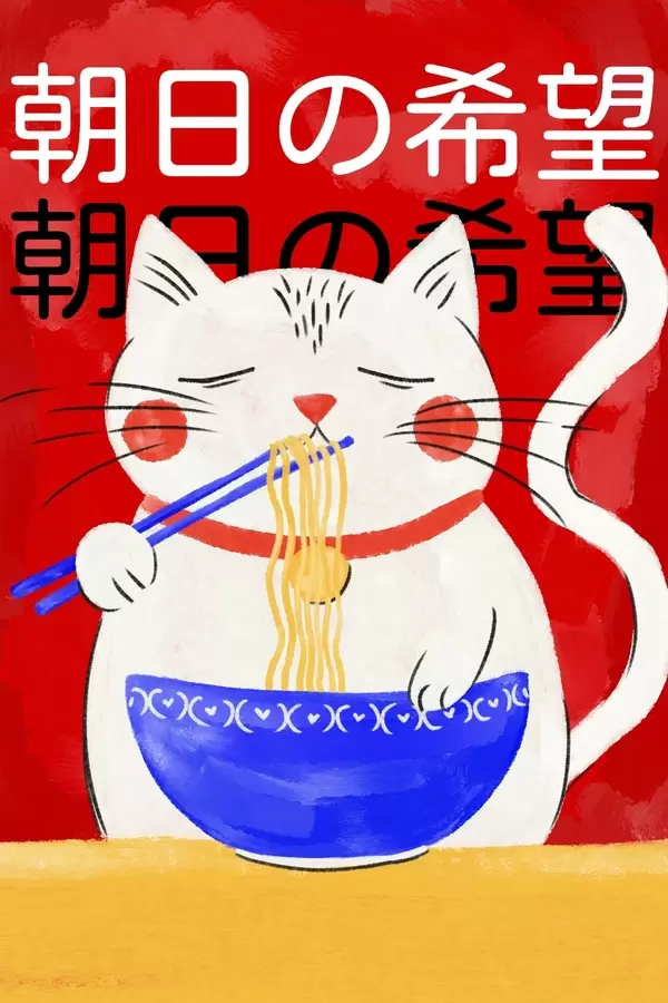 Poster Illustration représentant un chat en train de manger des nouilles sur fond rouge f48031