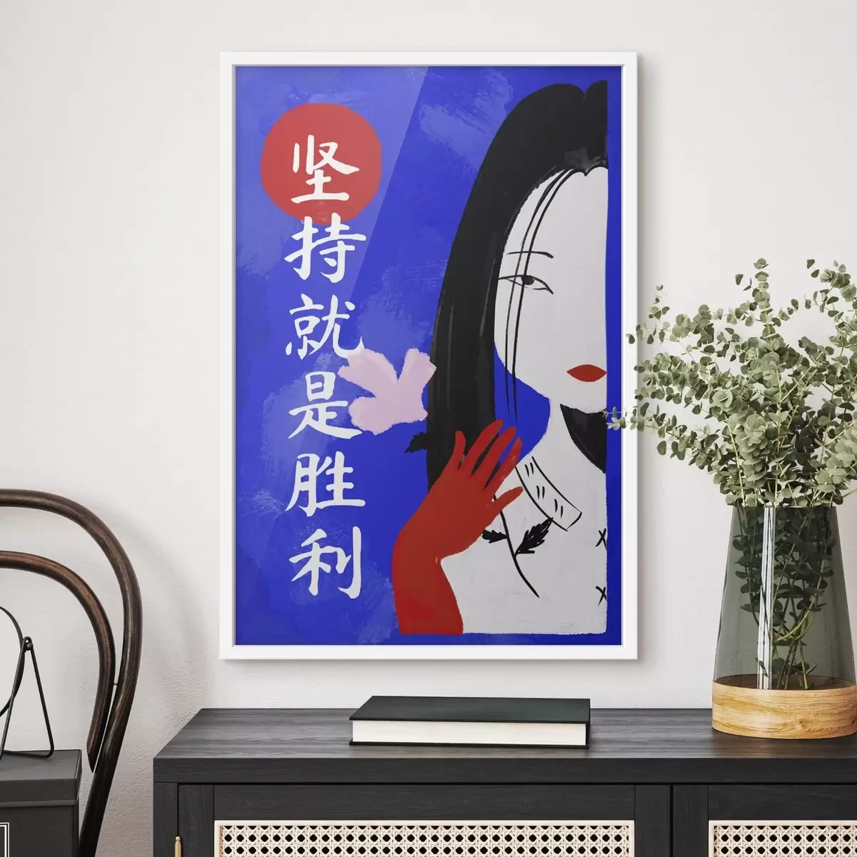 Poster Portrait stylisé d'une femme sur fond bleu, accompagné d'un texte Nr f48032