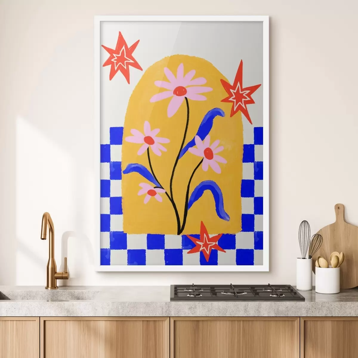 Poster Fleurs aux couleurs vives sur fond jaune avec des motifs bleus Nr f48034