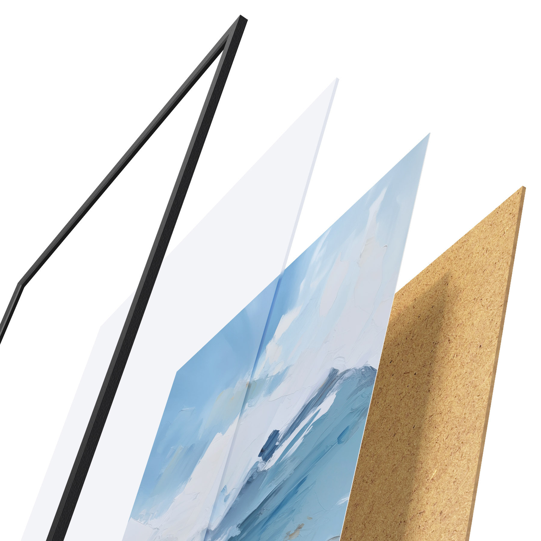 L’affiche encadrée est composée d’un cadre, d’un plexiglas, d’une image imprimée et d’un support en aggloméré. Elle est prête à être accrochée au mur grâce aux fixations situées à l’arrière.