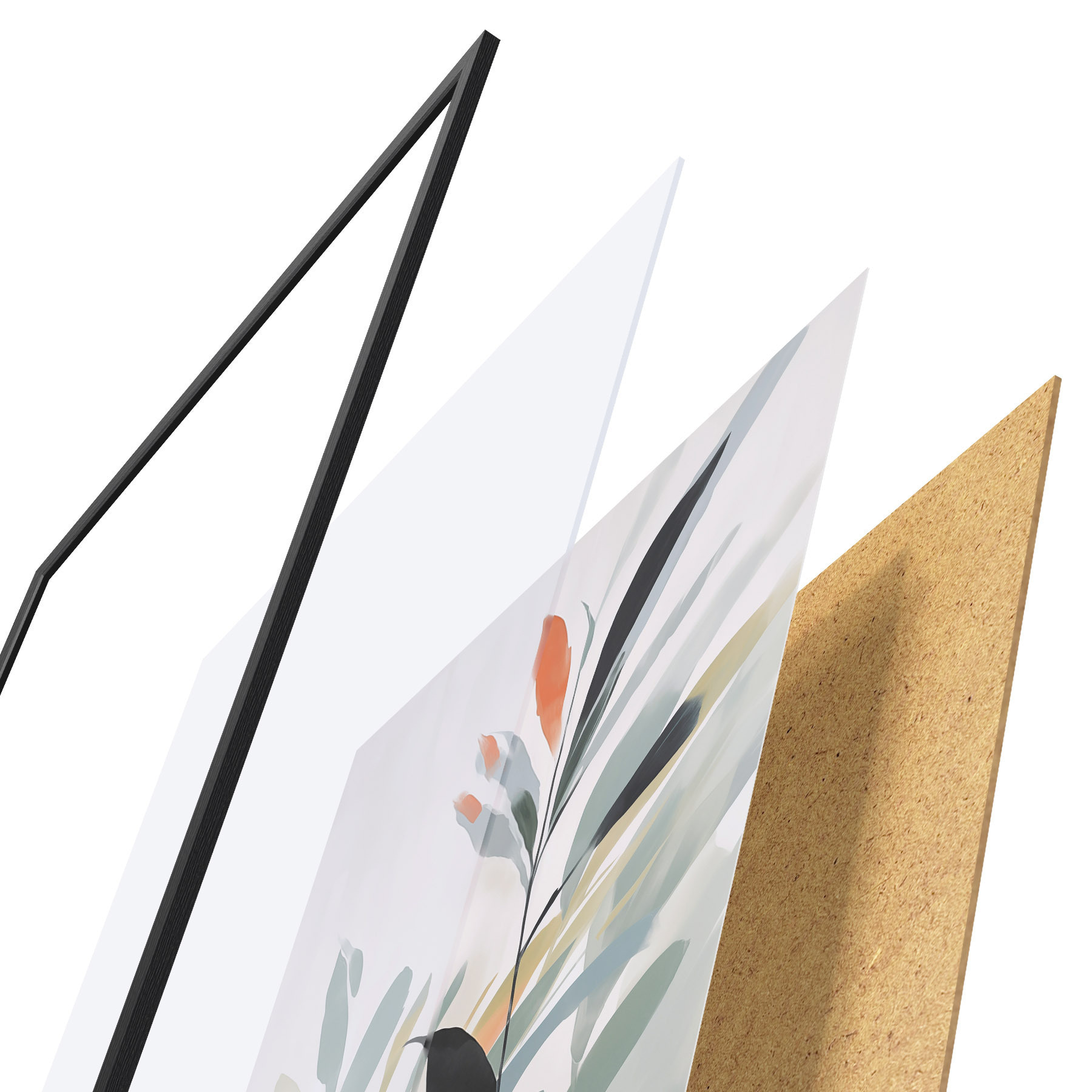 L’affiche encadrée est composée d’un cadre, d’un plexiglas, d’une image imprimée et d’un support en aggloméré. Elle est prête à être accrochée au mur grâce aux fixations situées à l’arrière.