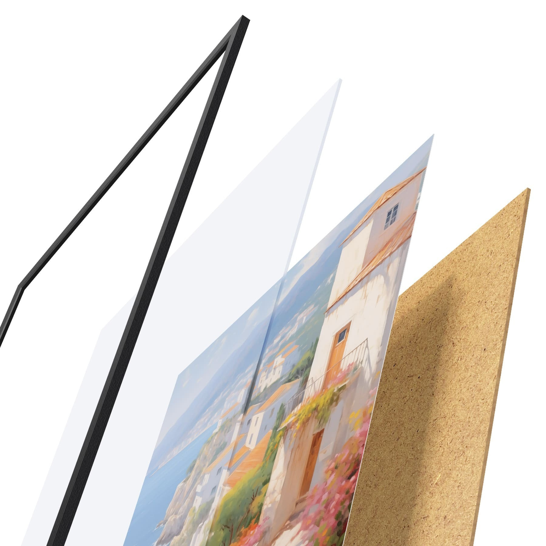 L’affiche encadrée est composée d’un cadre, d’un plexiglas, d’une image imprimée et d’un support en aggloméré. Elle est prête à être accrochée au mur grâce aux fixations situées à l’arrière.