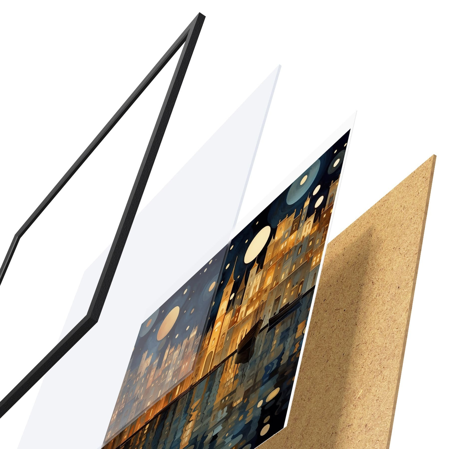 L’affiche encadrée est composée d’un cadre, d’un plexiglas, d’une image imprimée et d’un support en aggloméré. Elle est prête à être accrochée au mur grâce aux fixations situées à l’arrière.