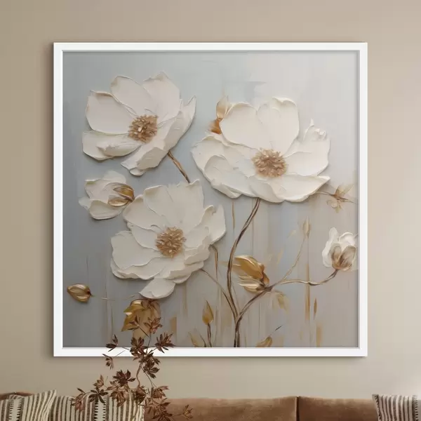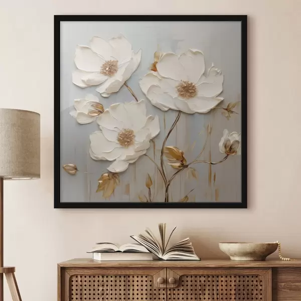 Poster Fleurs blanches en relief avec des feuilles chaudes f48093