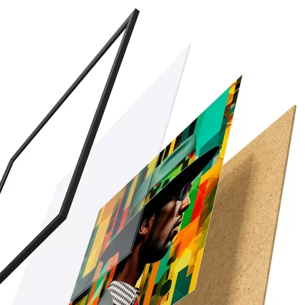 L’affiche encadrée est composée d’un cadre, d’un plexiglas, d’une image imprimée et d’un support en aggloméré. Elle est prête à être accrochée au mur grâce aux fixations situées à l’arrière.