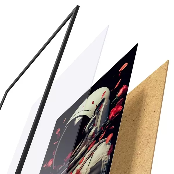 L’affiche encadrée est composée d’un cadre, d’un plexiglas, d’une image imprimée et d’un support en aggloméré. Elle est prête à être accrochée au mur grâce aux fixations situées à l’arrière.
