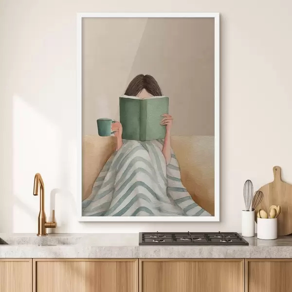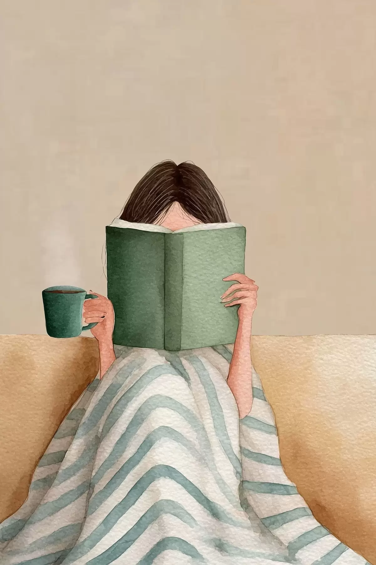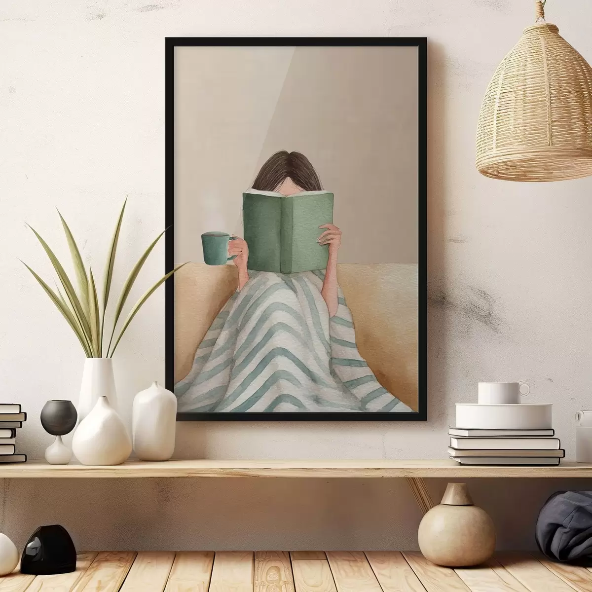 Poster Illustration à l'aquarelle représentant une femme assise sur un canapé en train de lire un livre. Nr f48114