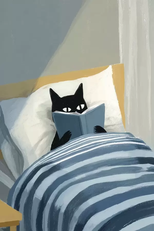 Poster Illustration minimaliste d'un chat noir lisant un livre dans son lit. f48117