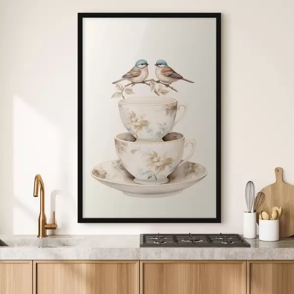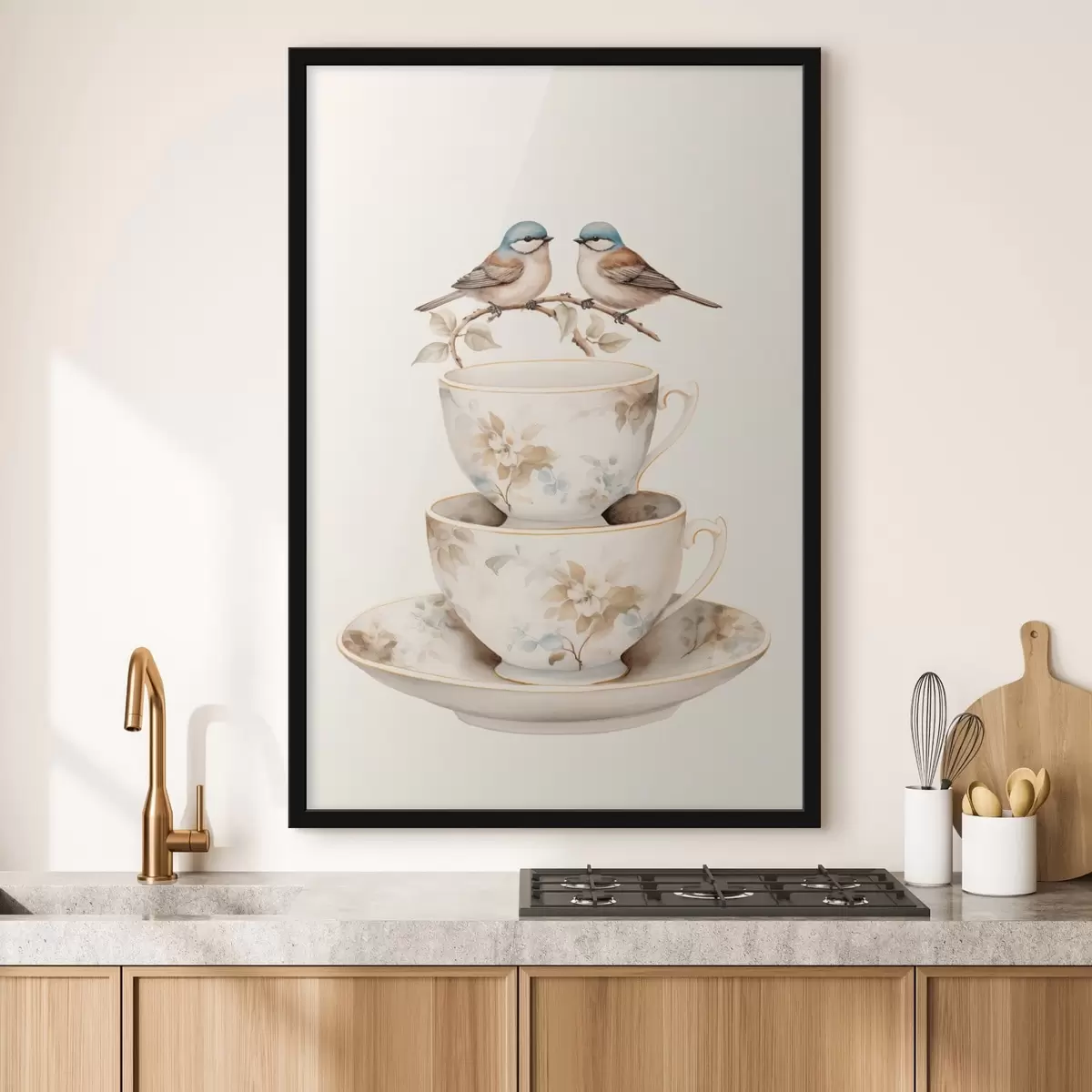 Poster Deux oiseaux sur une branche au-dessus de tasses à thé Nr f48347
