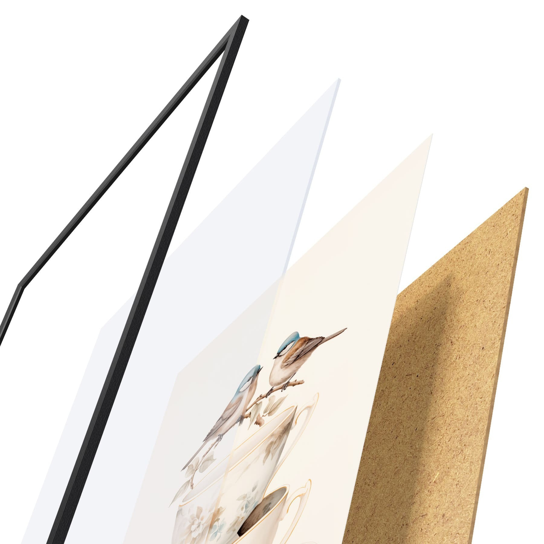 L’affiche encadrée est composée d’un cadre, d’un plexiglas, d’une image imprimée et d’un support en aggloméré. Elle est prête à être accrochée au mur grâce aux fixations situées à l’arrière.