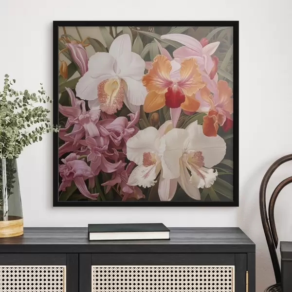 Poster Bouquet de fleurs tropicales, avec des orchidées et du feuillage vert en arrière-plan Nr f48385