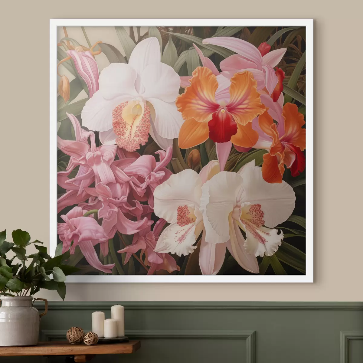 Poster Bouquet de fleurs tropicales, avec des orchidées et du feuillage vert en arrière-plan f48385