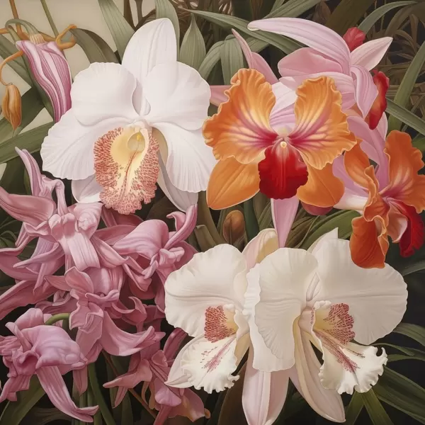 Poster Bouquet de fleurs tropicales, avec des orchidées et du feuillage vert en arrière-plan Nr f48385