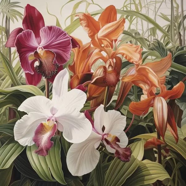 Poster Bouquet de fleurs tropicales, avec des orchidées et du feuillage vert en arrière-plan Nr f48386