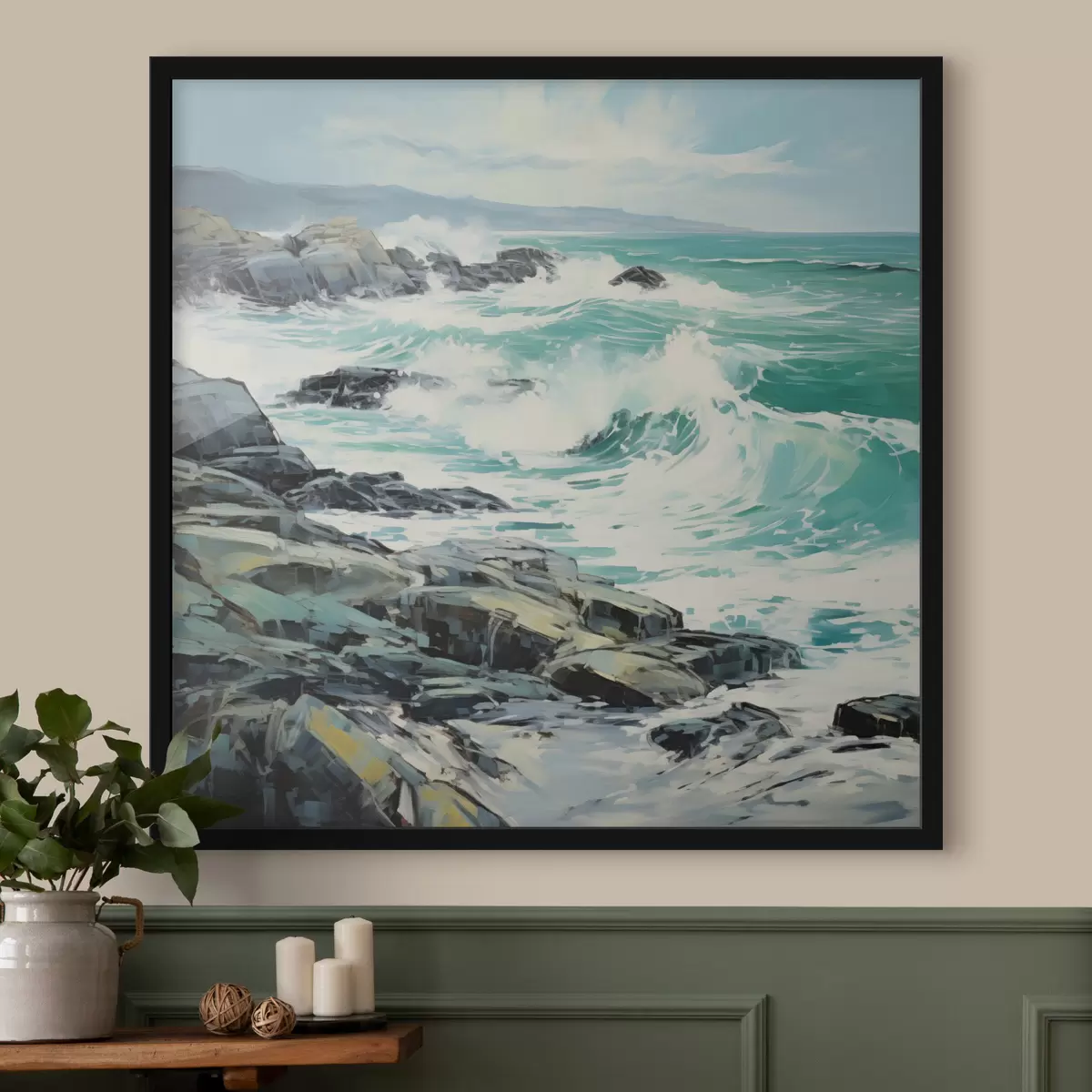 Poster Un paysage de côte rocheuse avec des vagues sous un ciel nuageux, style peinture f48388