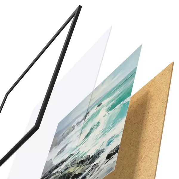 L’affiche encadrée est composée d’un cadre, d’un plexiglas, d’une image imprimée et d’un support en aggloméré. Elle est prête à être accrochée au mur grâce aux fixations situées à l’arrière.