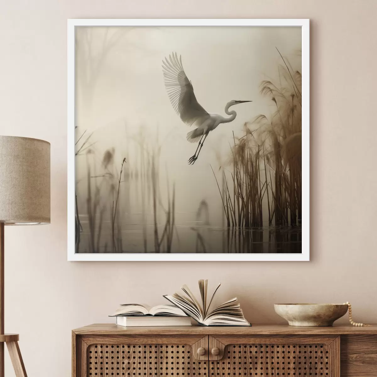 Poster Une aigrette blanche survole un lac, entourée de hauts roseaux et d'arbres en arrière-plan f48389