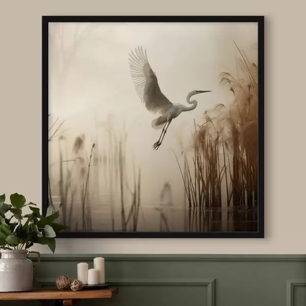 Poster Une aigrette blanche survole un lac, entourée de hauts roseaux et d'arbres en arrière-plan Nr f48389