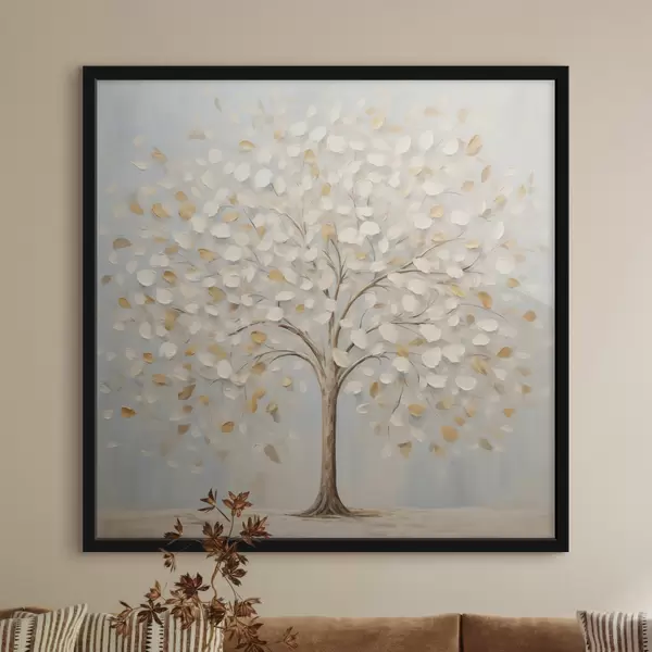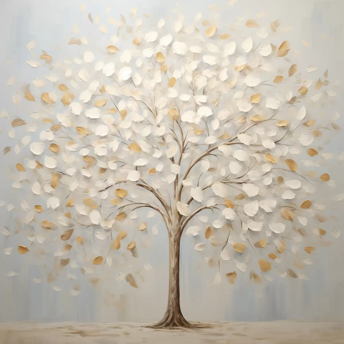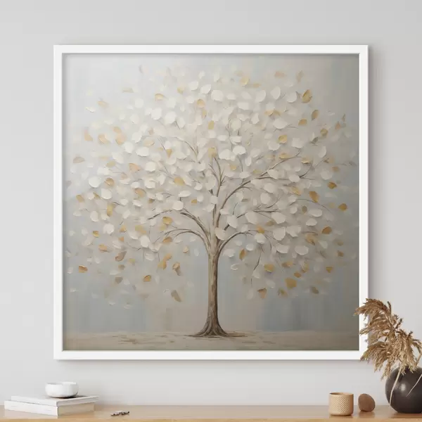 Poster Une peinture au style texturé représentant un arbre aux feuilles blanches et jaunes sur fond bleu clair Nr f48391