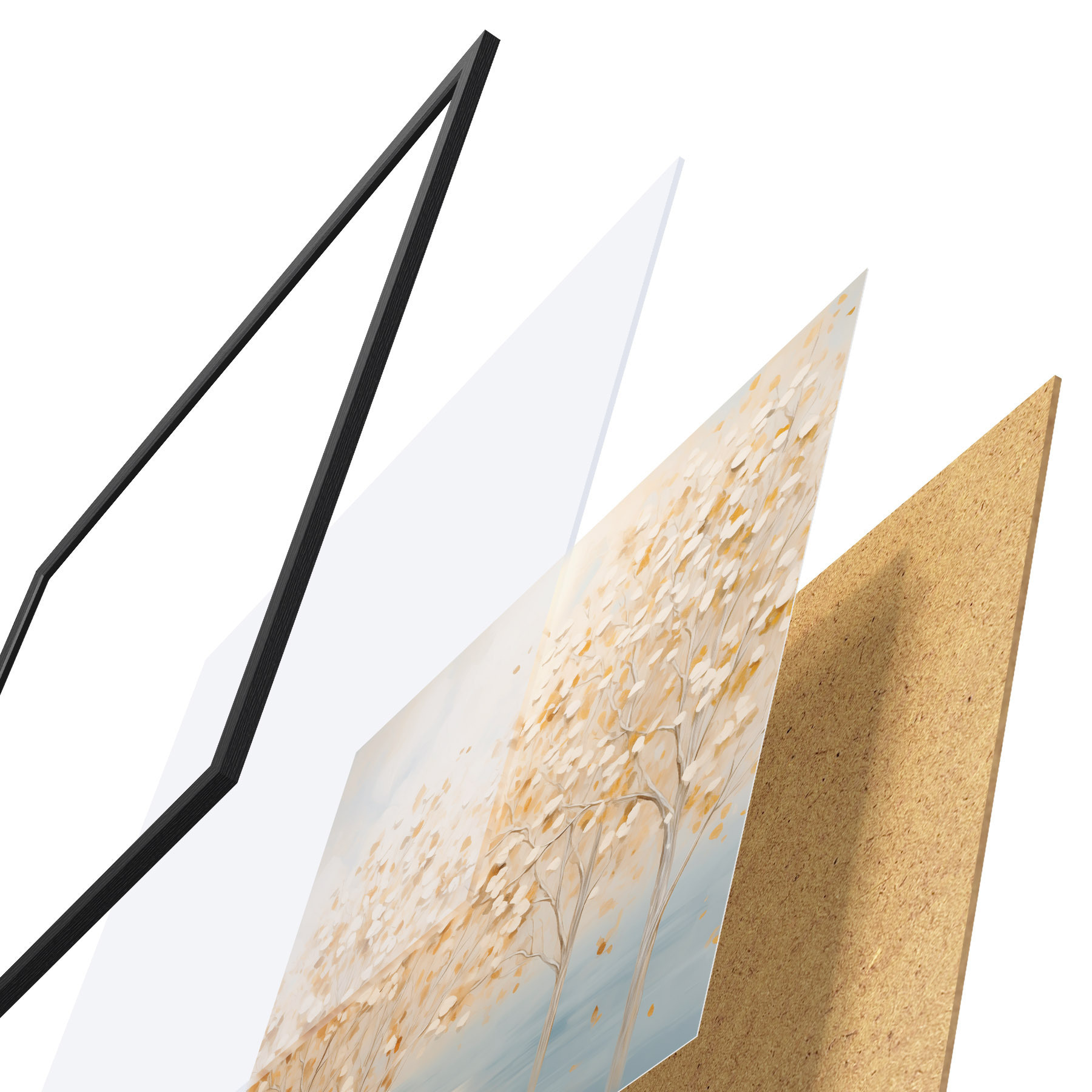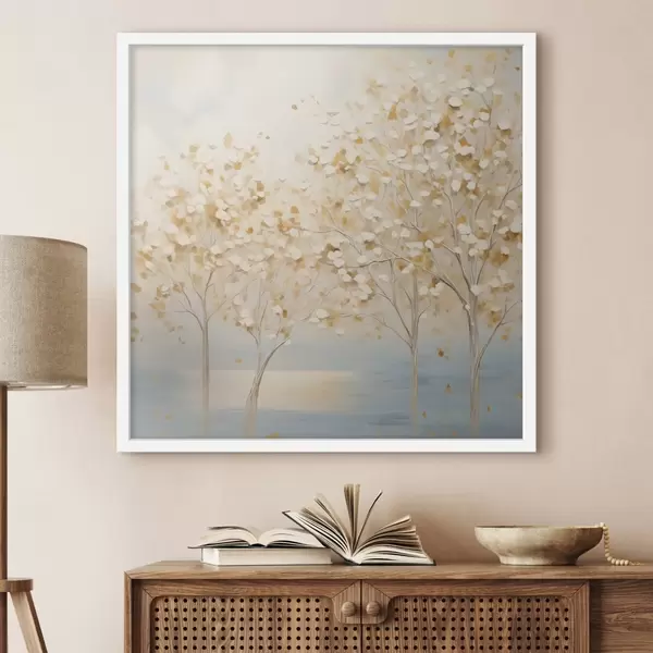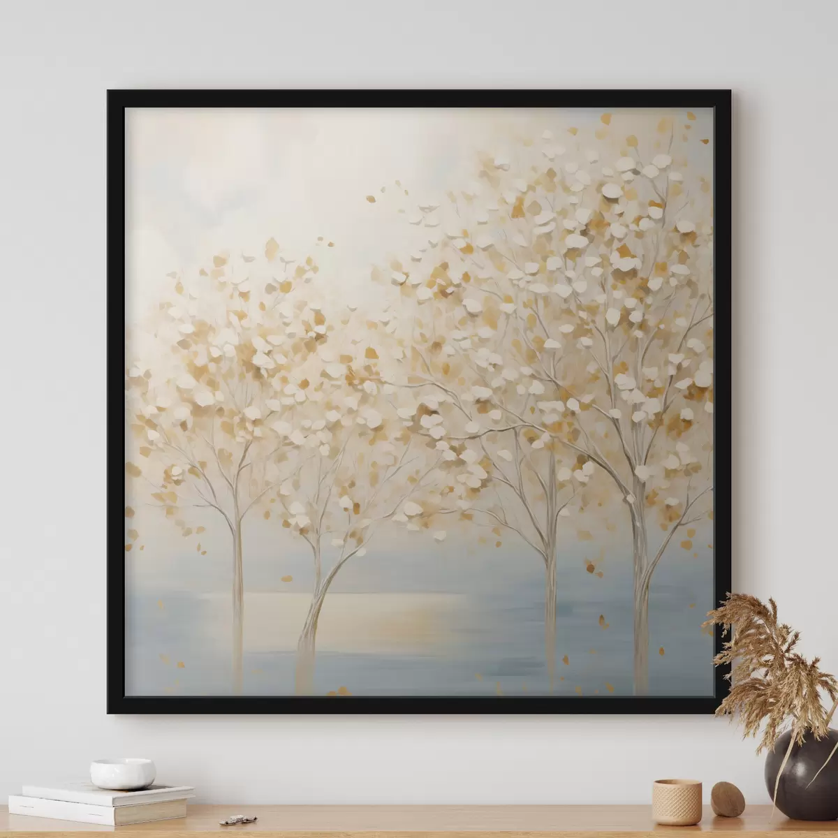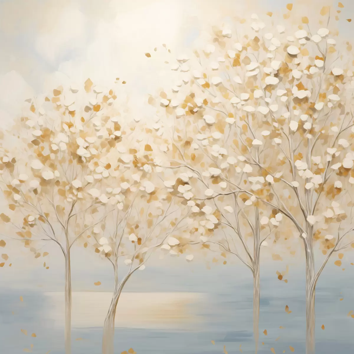 Poster Une peinture au style texturé représentant des arbres aux feuilles blanches et jaunes sur un fond bleu clair Nr f48392