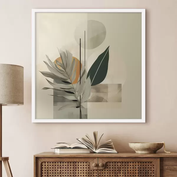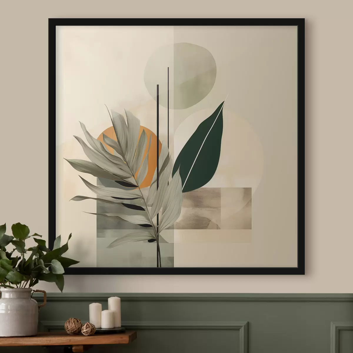 Poster Une plante vert foncé aux formes géométriques abstraites et aux textures aquarellées dans les tons beiges et verts f48410