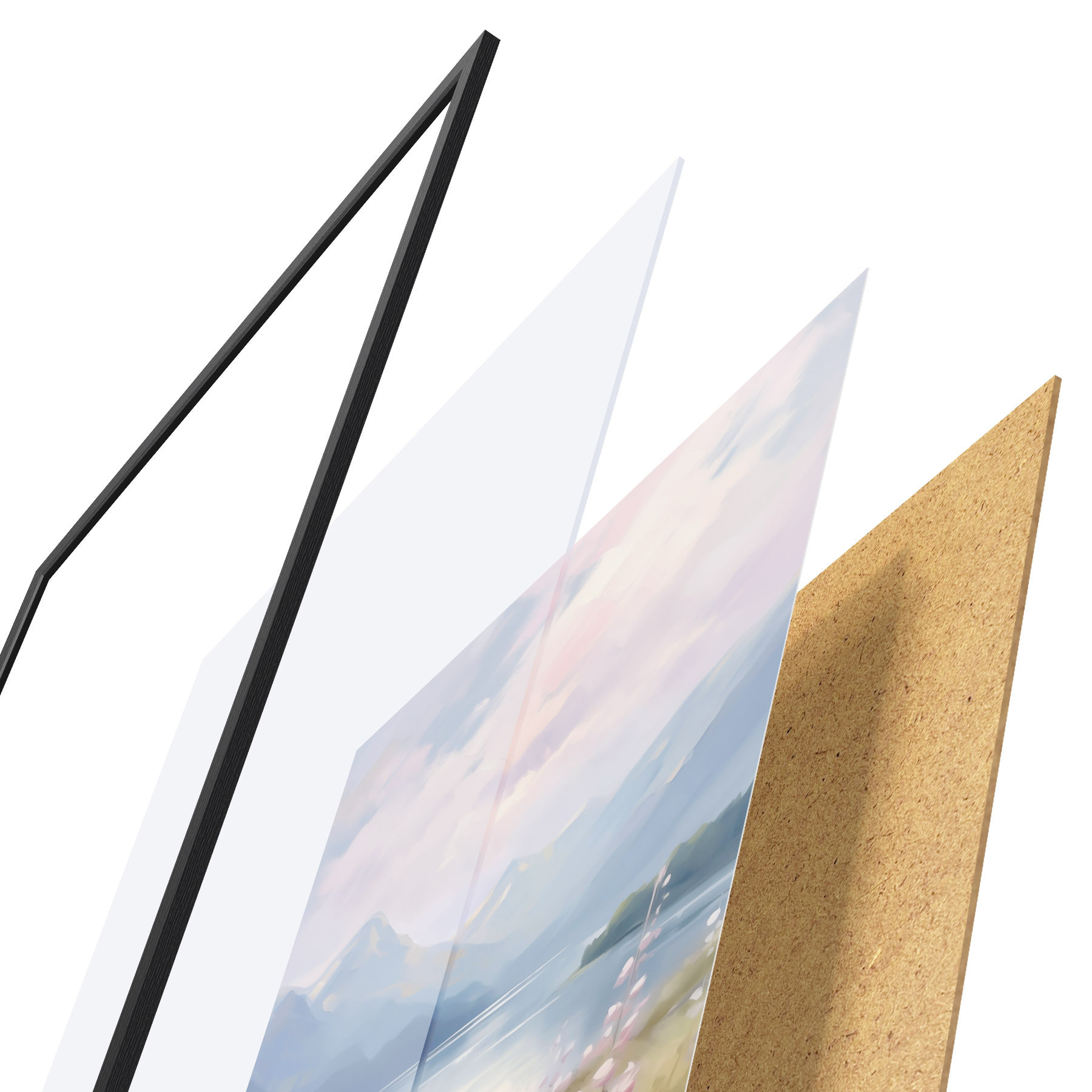 L’affiche encadrée est composée d’un cadre, d’un plexiglas, d’une image imprimée et d’un support en aggloméré. Elle est prête à être accrochée au mur grâce aux fixations situées à l’arrière.
