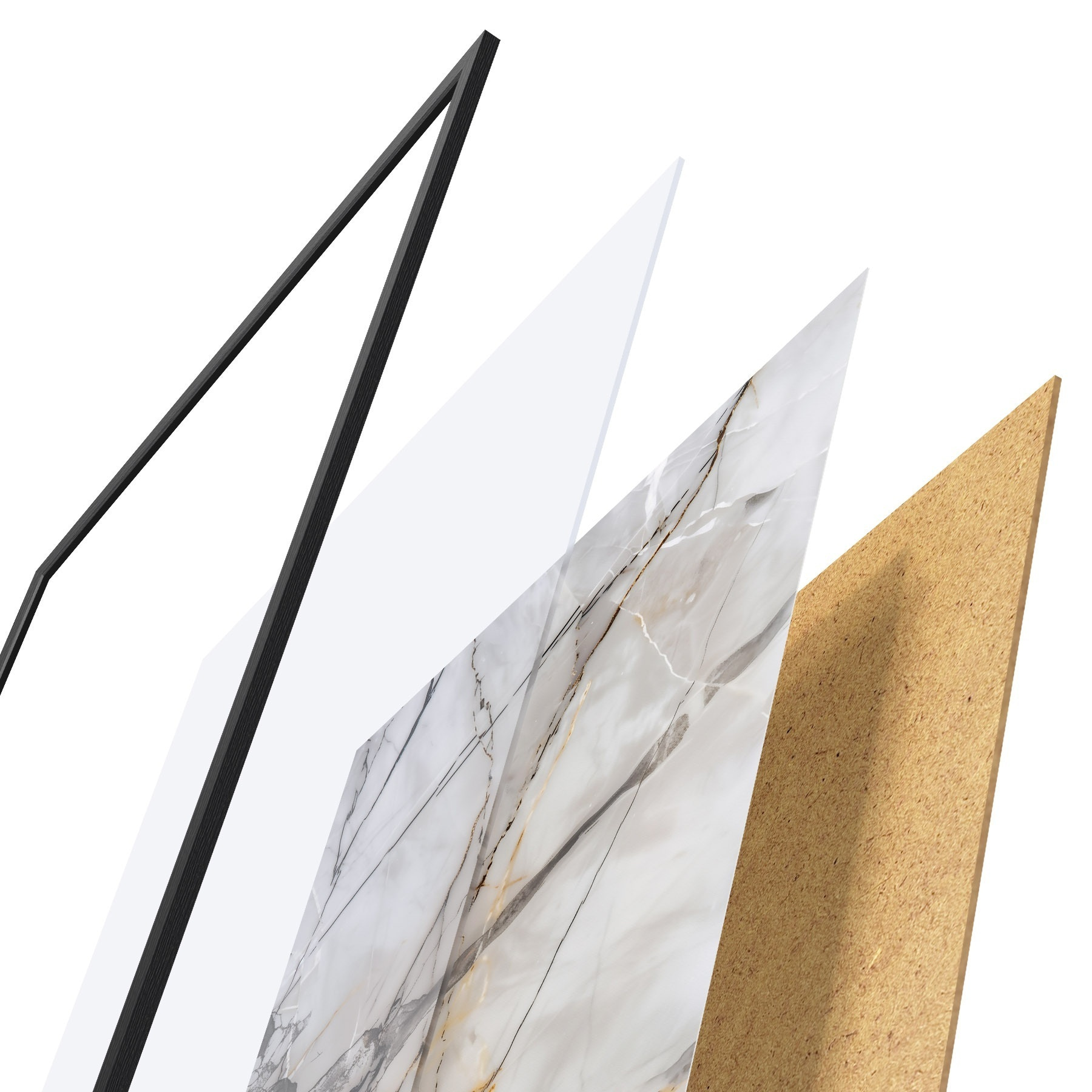 L’affiche encadrée est composée d’un cadre, d’un plexiglas, d’une image imprimée et d’un support en aggloméré. Elle est prête à être accrochée au mur grâce aux fixations situées à l’arrière.