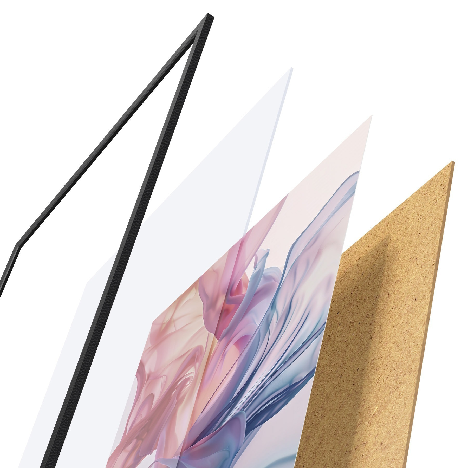 L’affiche encadrée est composée d’un cadre, d’un plexiglas, d’une image imprimée et d’un support en aggloméré. Elle est prête à être accrochée au mur grâce aux fixations situées à l’arrière.