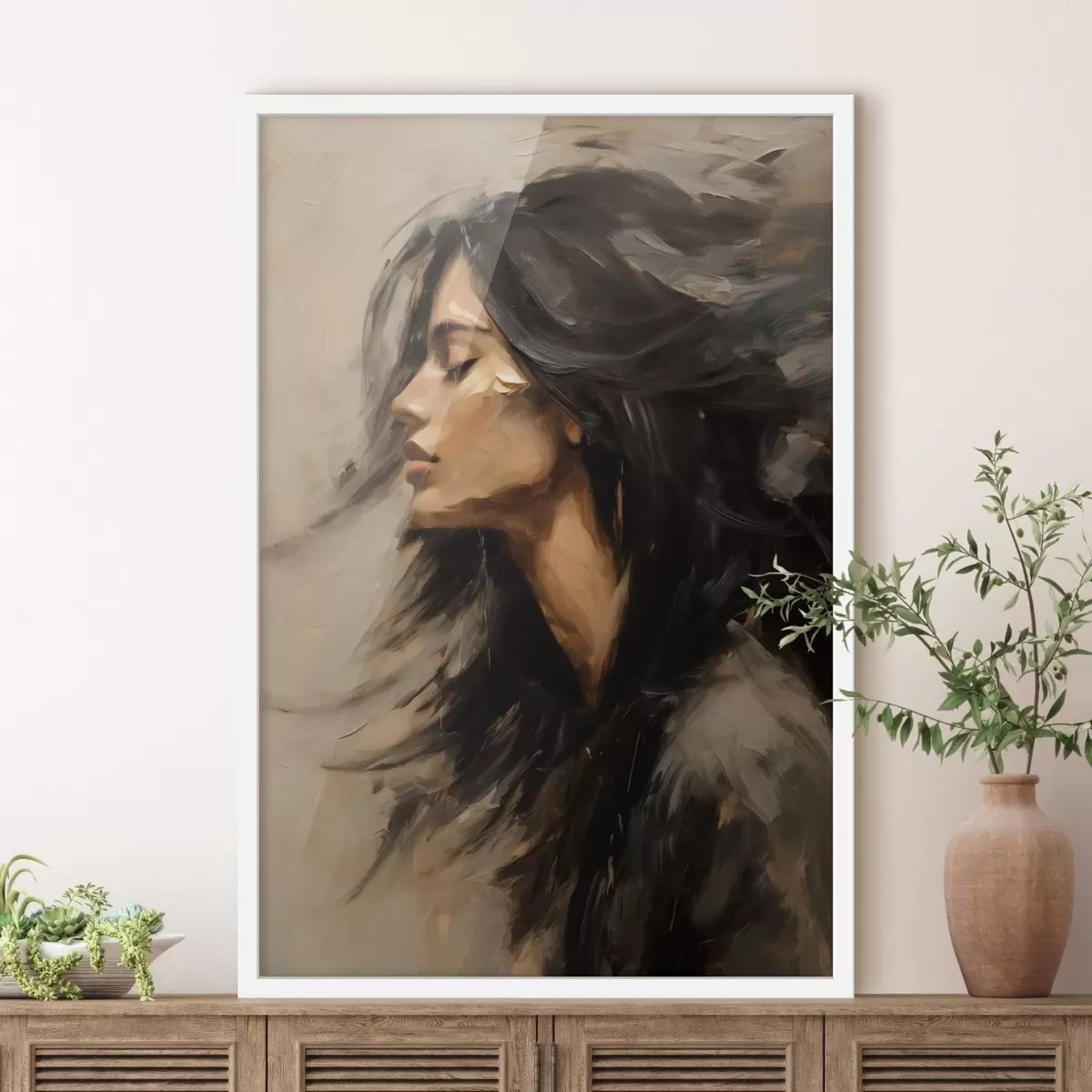 Poster Portrait d'une femme aux cheveux flottants, dans un style pictural f48622