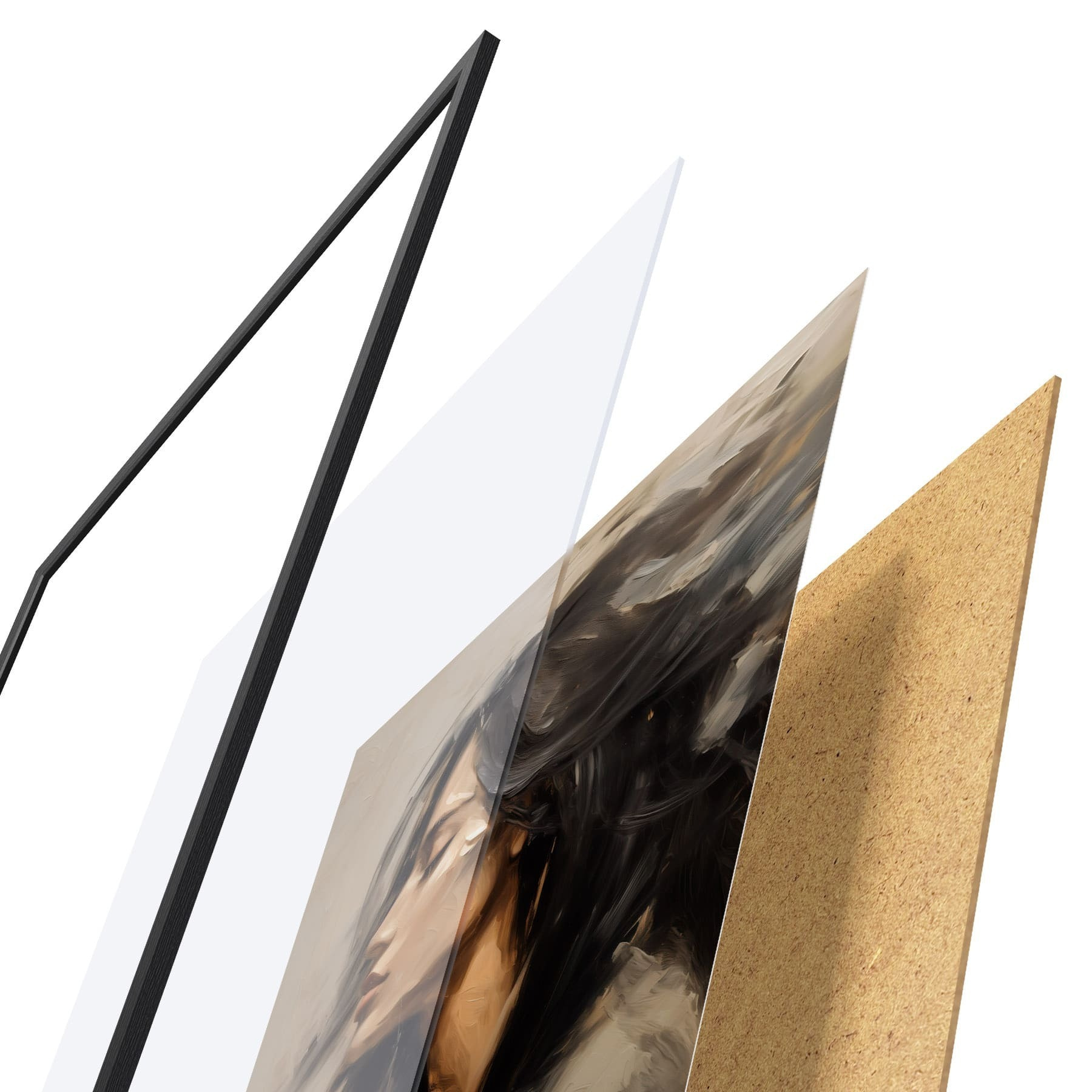 L’affiche encadrée est composée d’un cadre, d’un plexiglas, d’une image imprimée et d’un support en aggloméré. Elle est prête à être accrochée au mur grâce aux fixations situées à l’arrière.