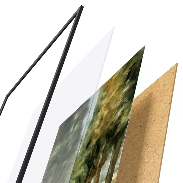 L’affiche encadrée est composée d’un cadre, d’un plexiglas, d’une image imprimée et d’un support en aggloméré. Elle est prête à être accrochée au mur grâce aux fixations situées à l’arrière.