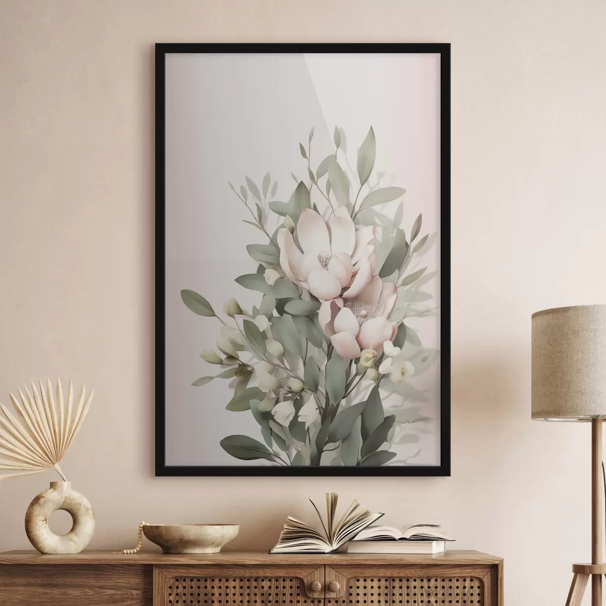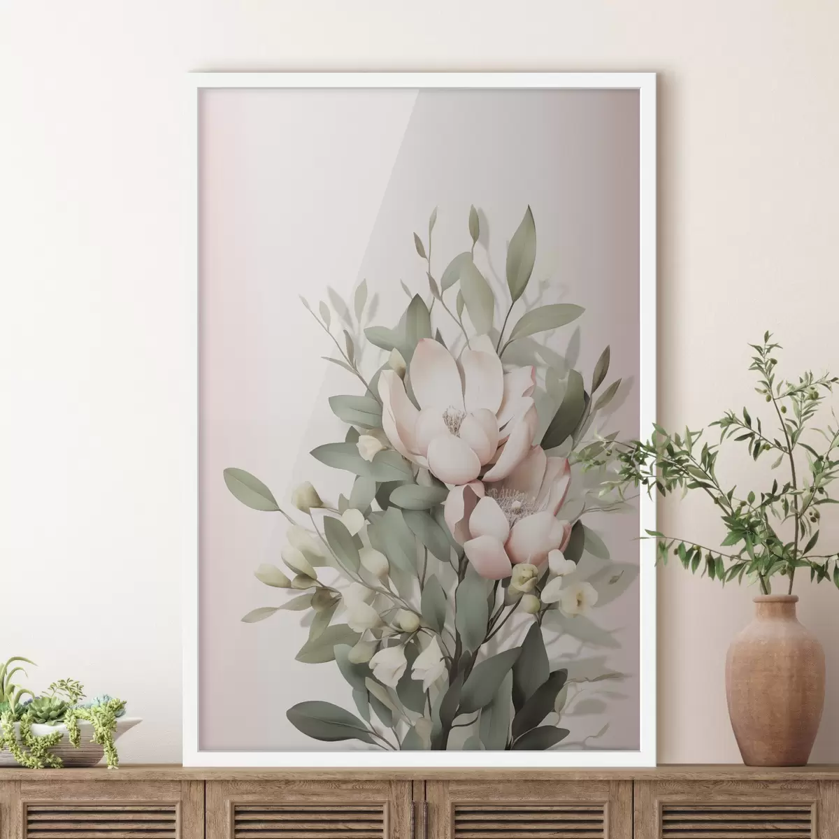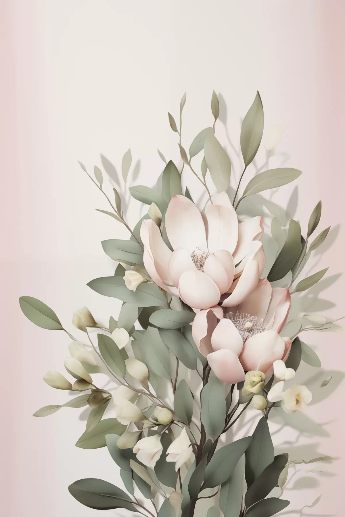 Poster Un bouquet de fleurs aux couleurs pastel avec des feuilles d'eucalyptus, sur fond rose pâle Nr f48728