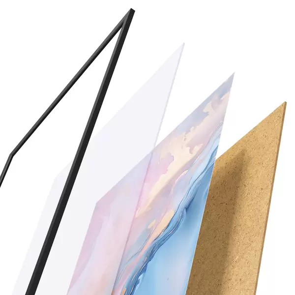 L’affiche encadrée est composée d’un cadre, d’un plexiglas, d’une image imprimée et d’un support en aggloméré. Elle est prête à être accrochée au mur grâce aux fixations situées à l’arrière.