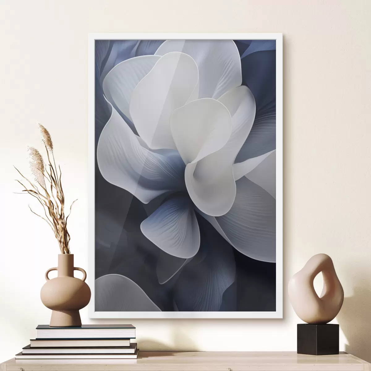 Poster Pétales de fleurs abstraites bleues et blanches sur fond sombre f48732