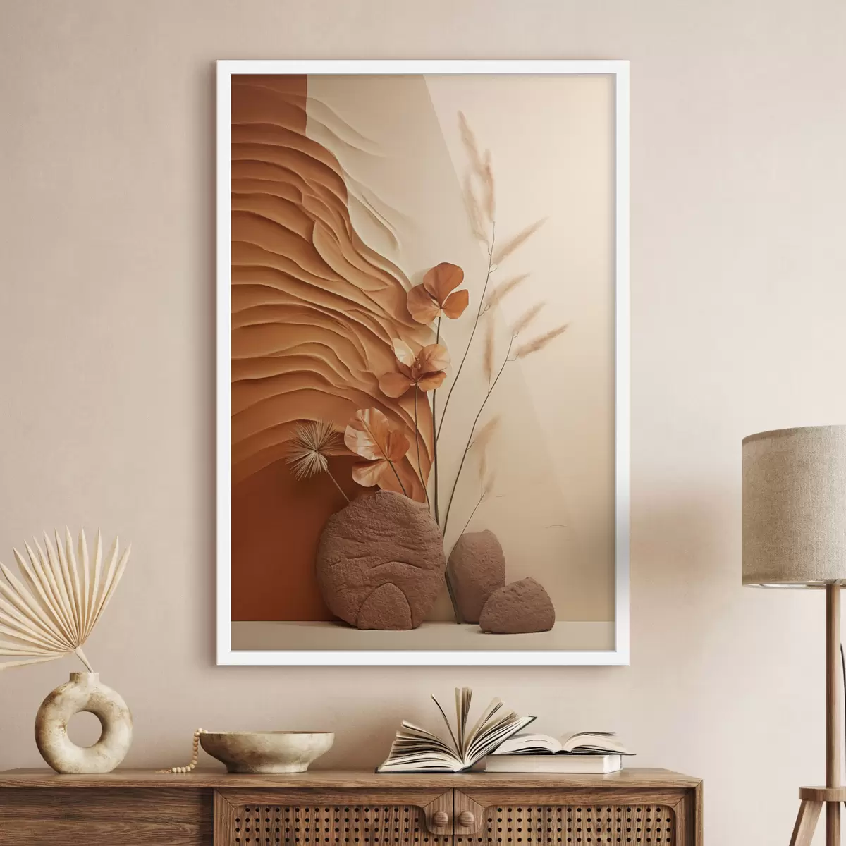 Poster Une œuvre minimaliste composée de fleurs séchées et d'herbe de la pampa, sur un fond texturé f48739