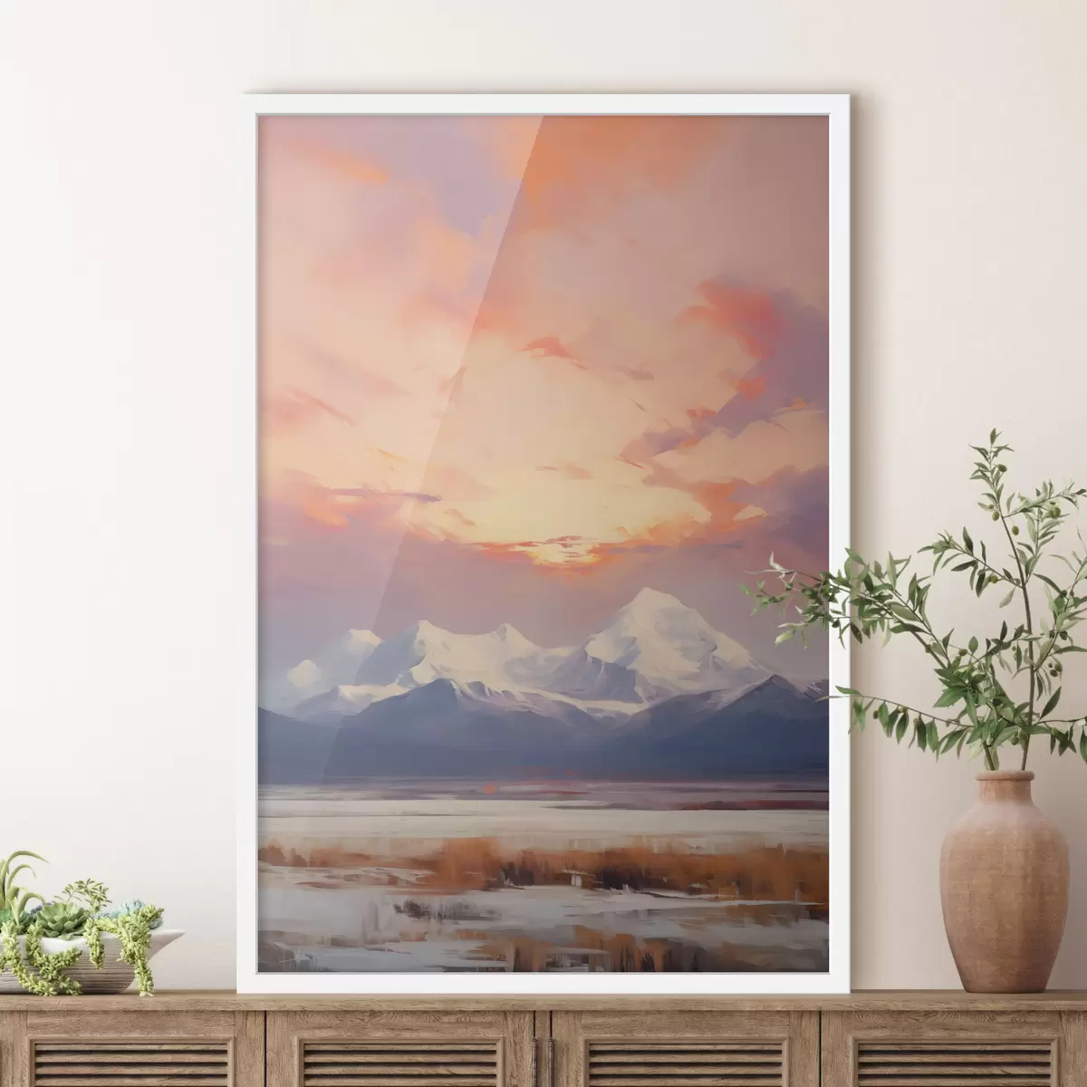 Poster Des montagnes aux sommets enneigés sous un ciel aux teintes vives d'orange et de rose, parsemé de nuages Nr f48742