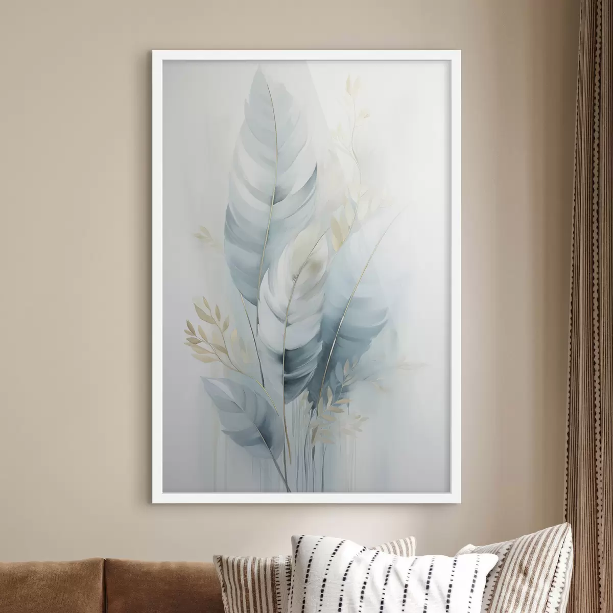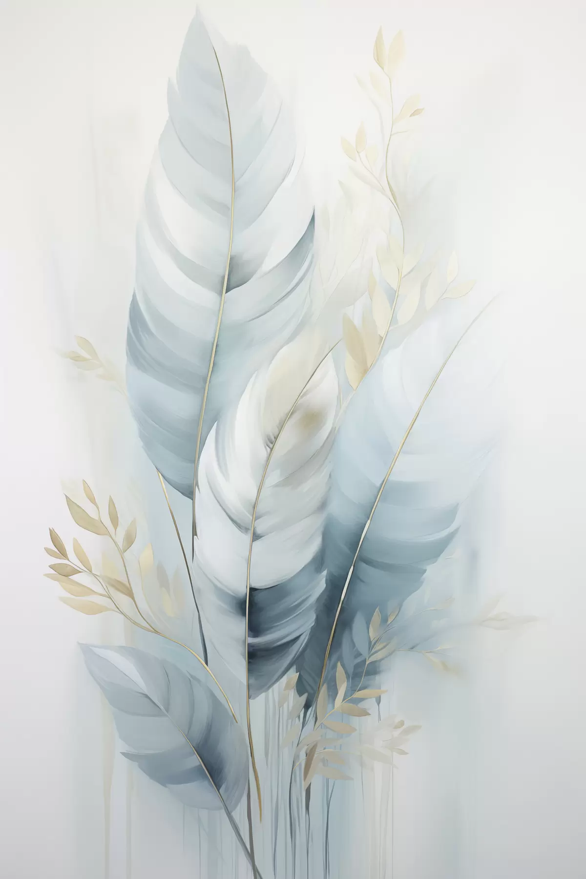 Poster De grandes plumes douces dans des tons de bleu et de blanc, ornées de délicates feuilles beiges Nr f48749
