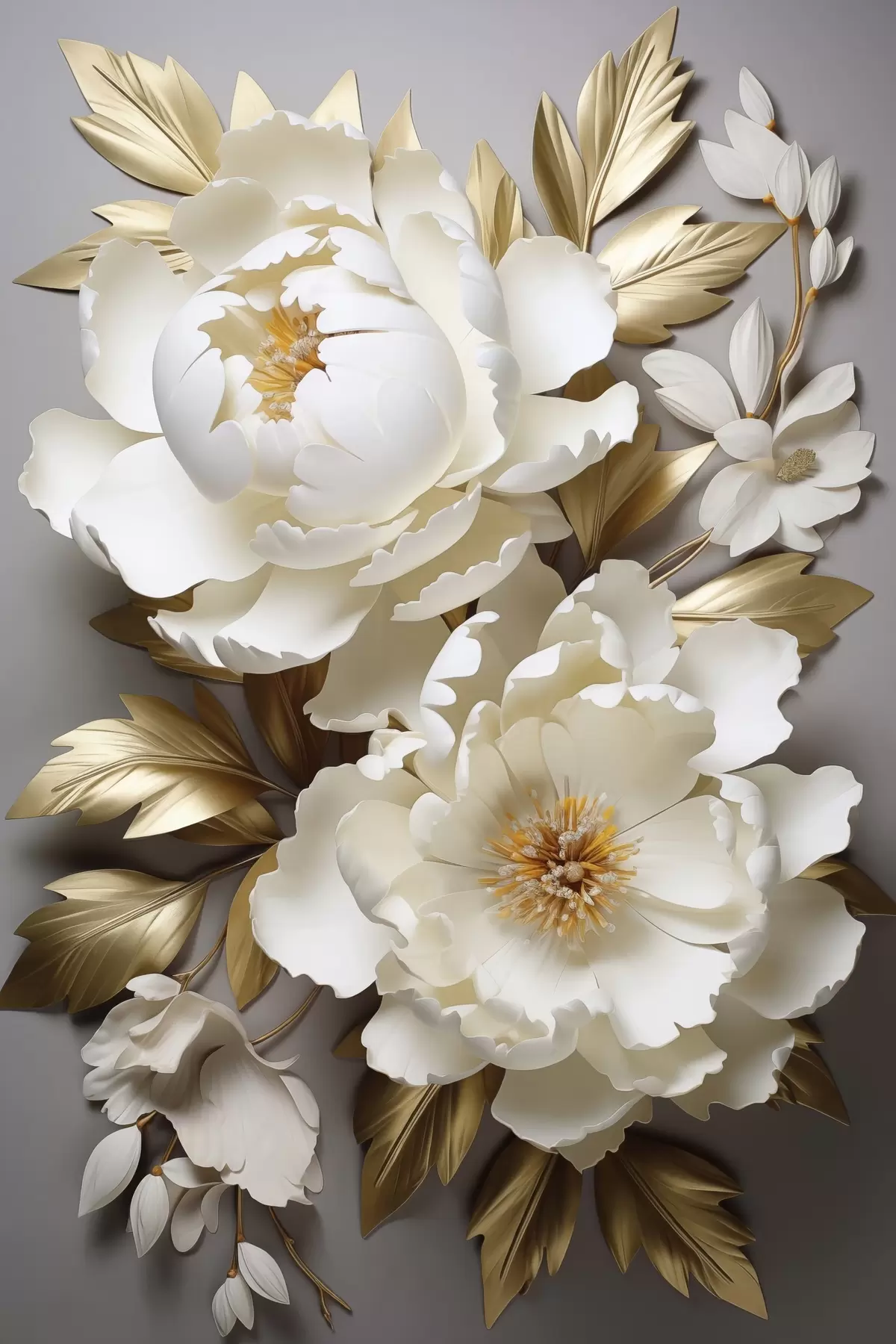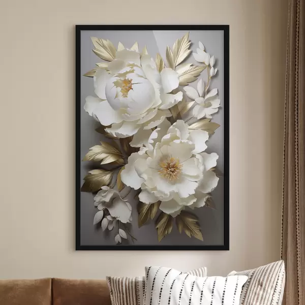 Poster De grandes pivoines blanches aux feuilles jaunes sur fond gris f48753