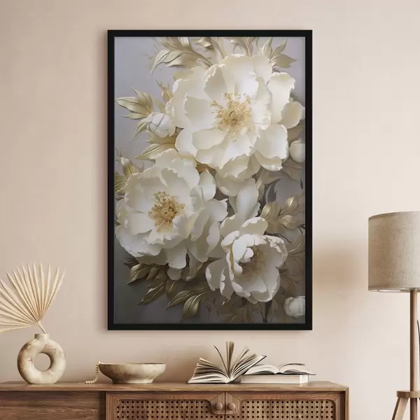 Poster De grandes pivoines blanches aux feuilles jaunes sur fond gris f48754