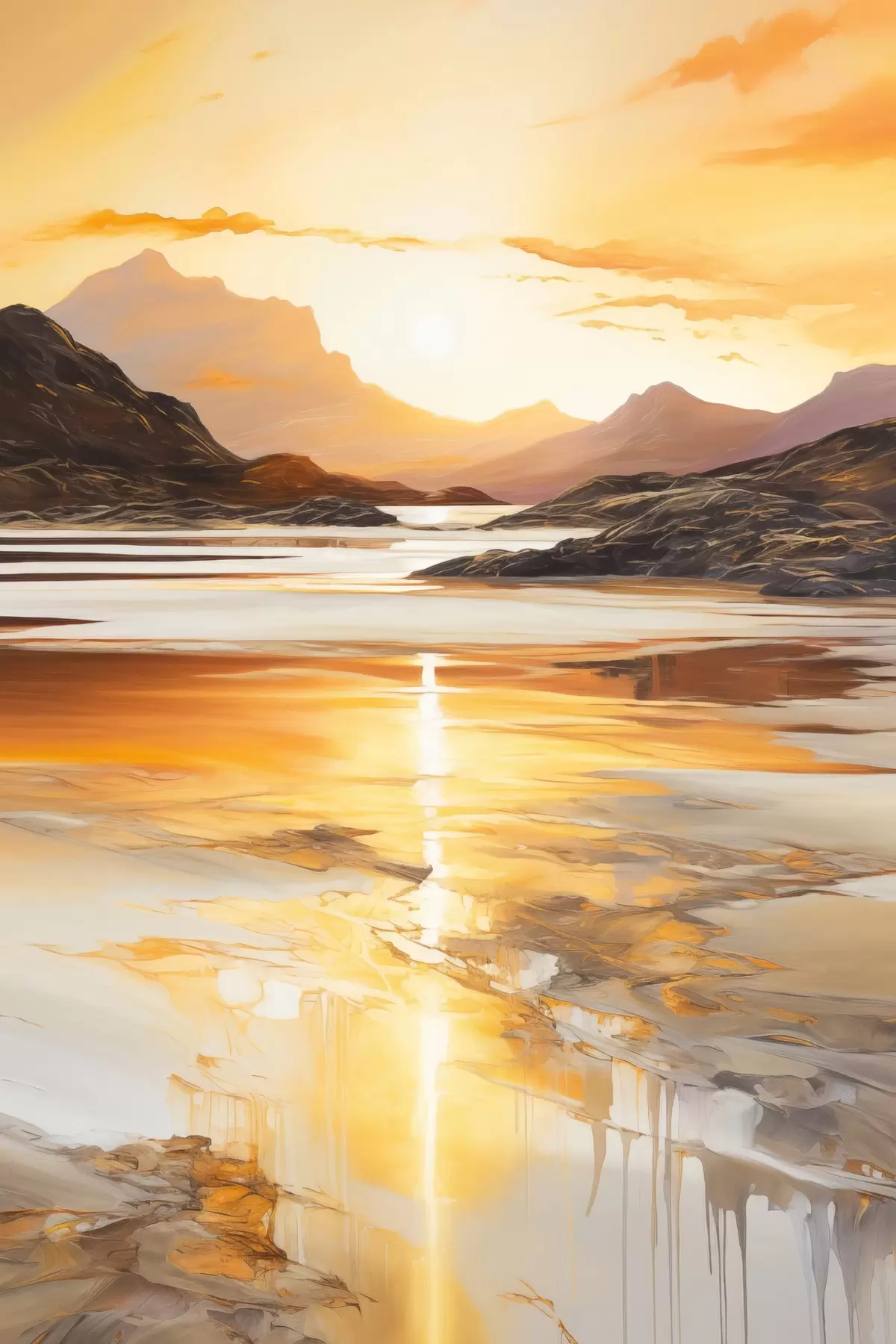 Poster Un paysage avec une rivière et des montagnes sous un ciel orange aux teintes chaudes, au coucher du soleil Nr f48755