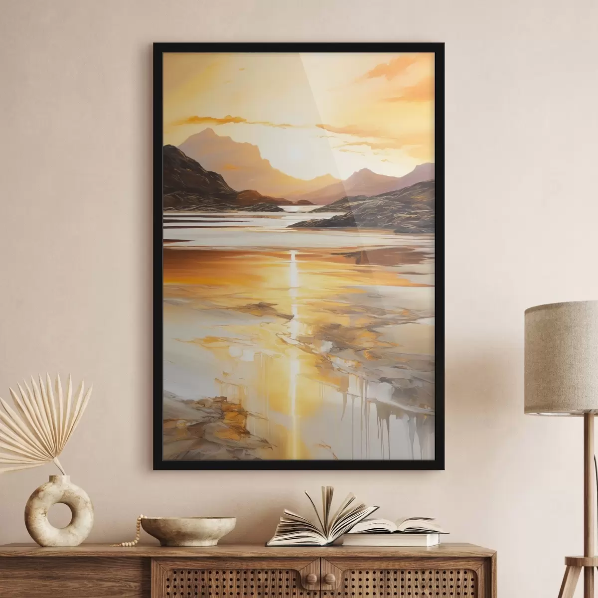 Poster Un paysage avec une rivière et des montagnes sous un ciel orange aux teintes chaudes, au coucher du soleil f48755