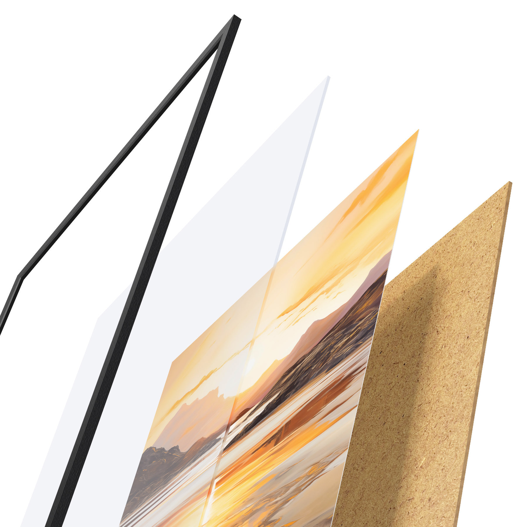L’affiche encadrée est composée d’un cadre, d’un plexiglas, d’une image imprimée et d’un support en aggloméré. Elle est prête à être accrochée au mur grâce aux fixations situées à l’arrière.