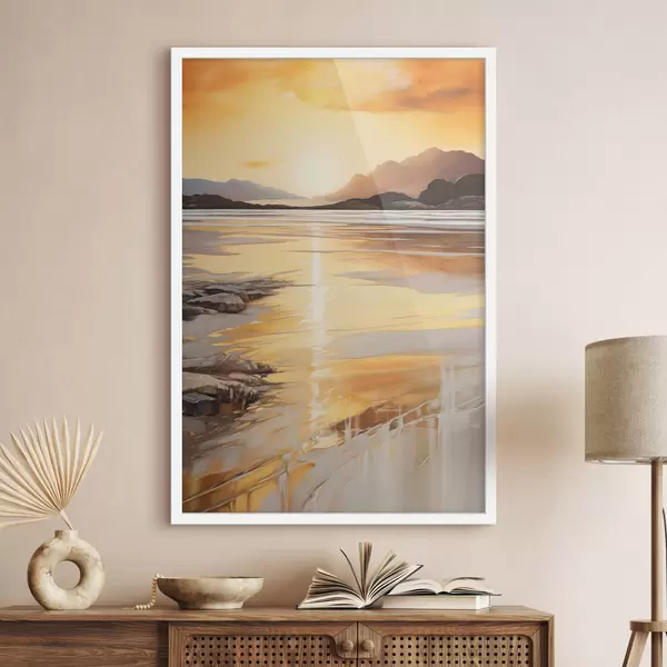 Poster Un paysage avec une rivière et des montagnes sous un ciel orange aux teintes chaudes, au coucher du soleil Nr f48756
