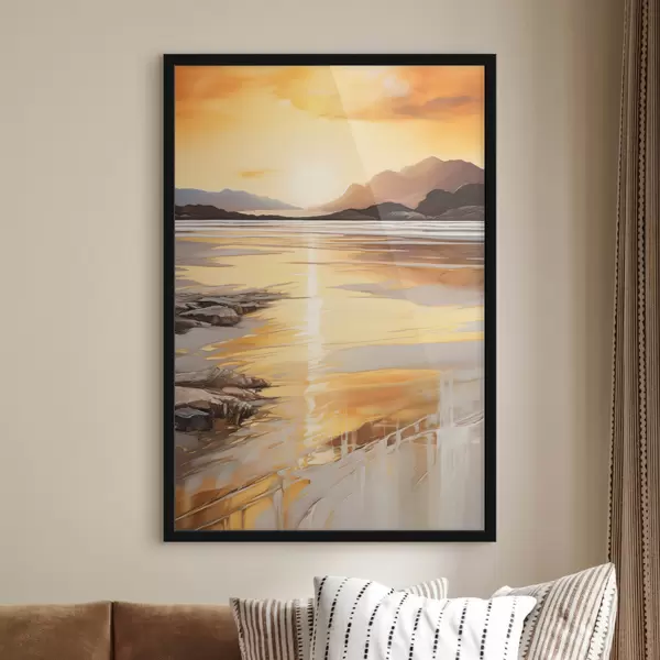 Poster Un paysage avec une rivière et des montagnes sous un ciel orange aux teintes chaudes, au coucher du soleil f48756