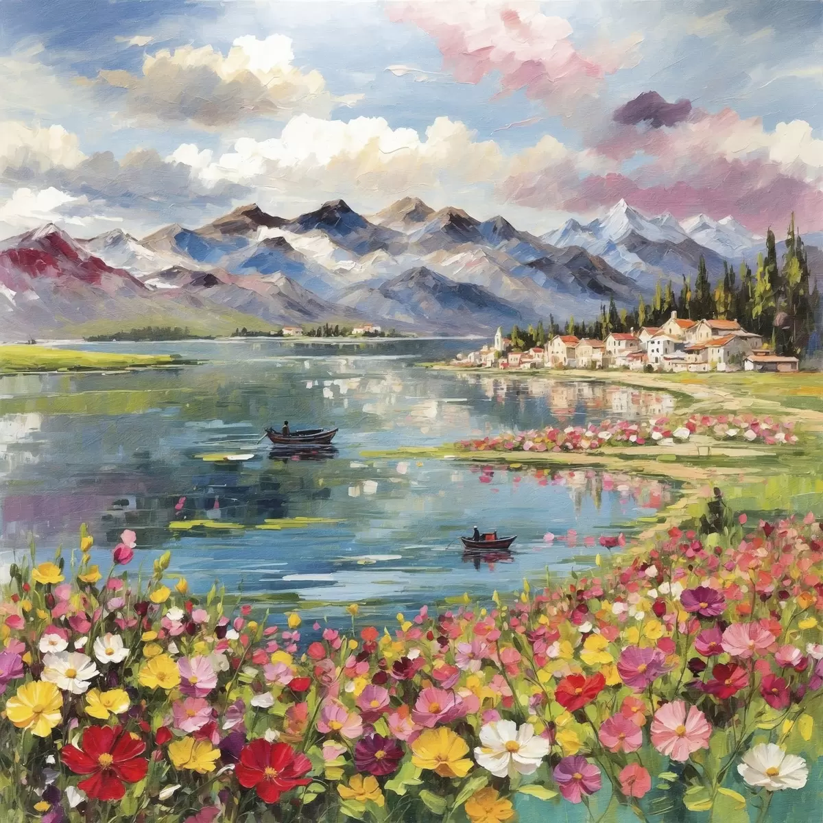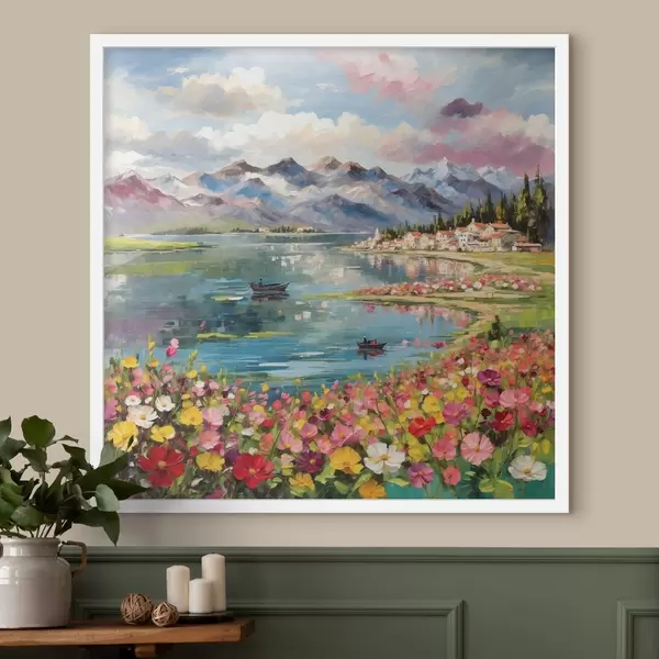 Poster Lac de montagne de style impressionniste avec des bateaux et des fleurs f48806