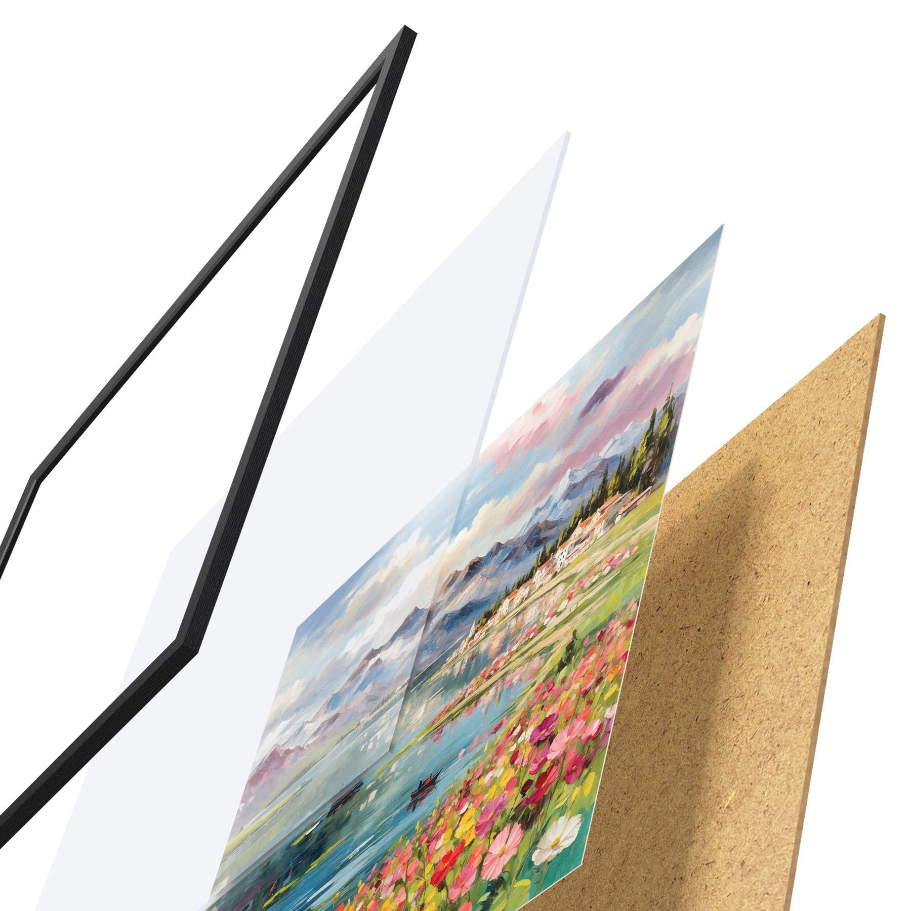 Poster Lac de montagne de style impressionniste avec des bateaux et des fleurs Nr f48806