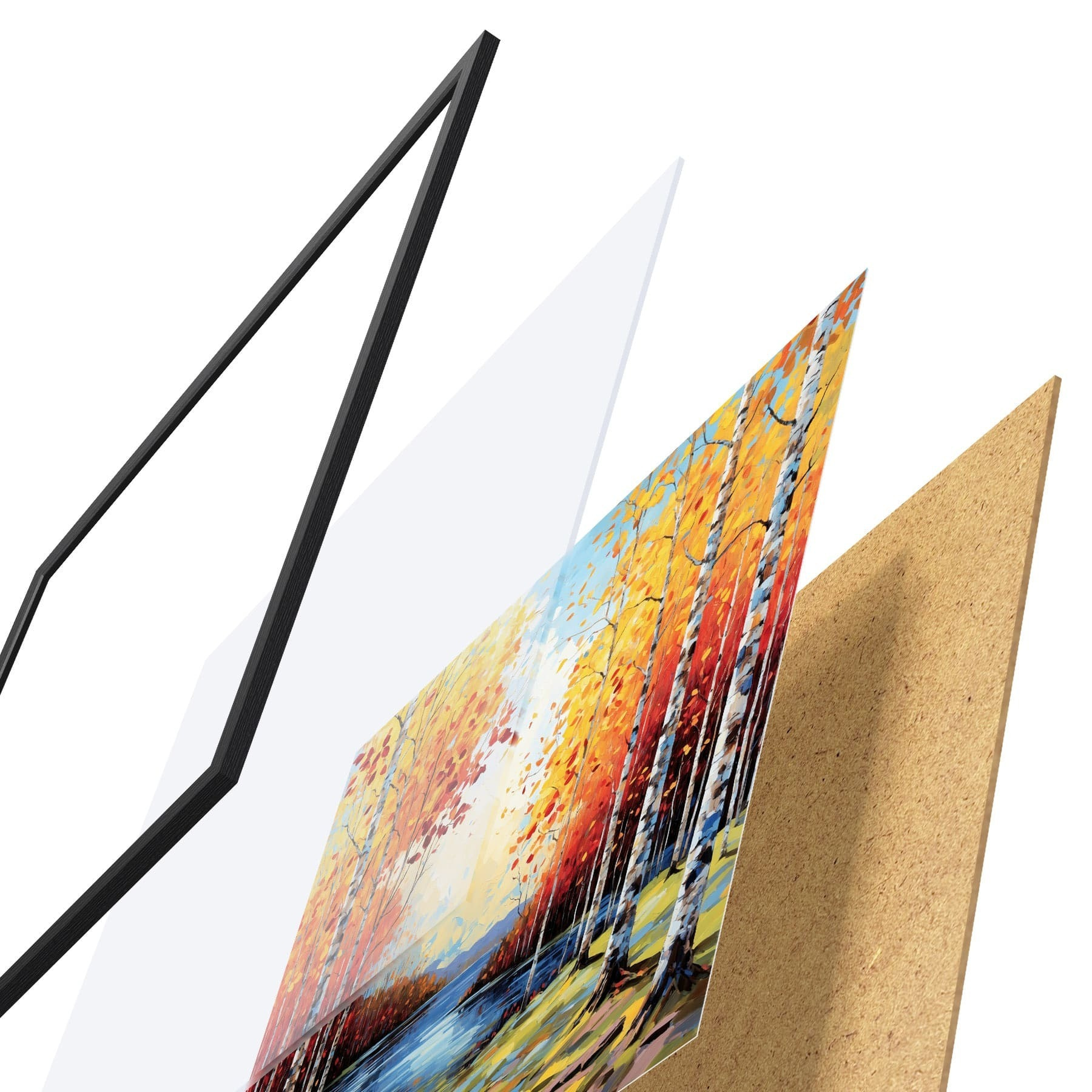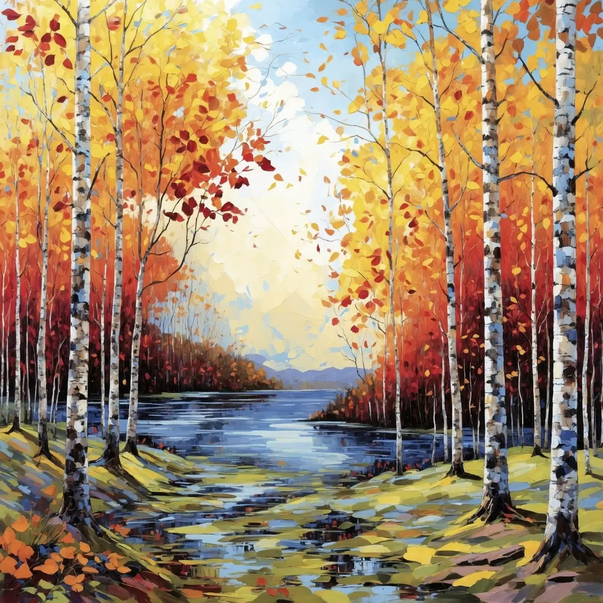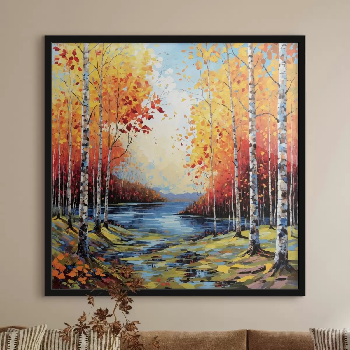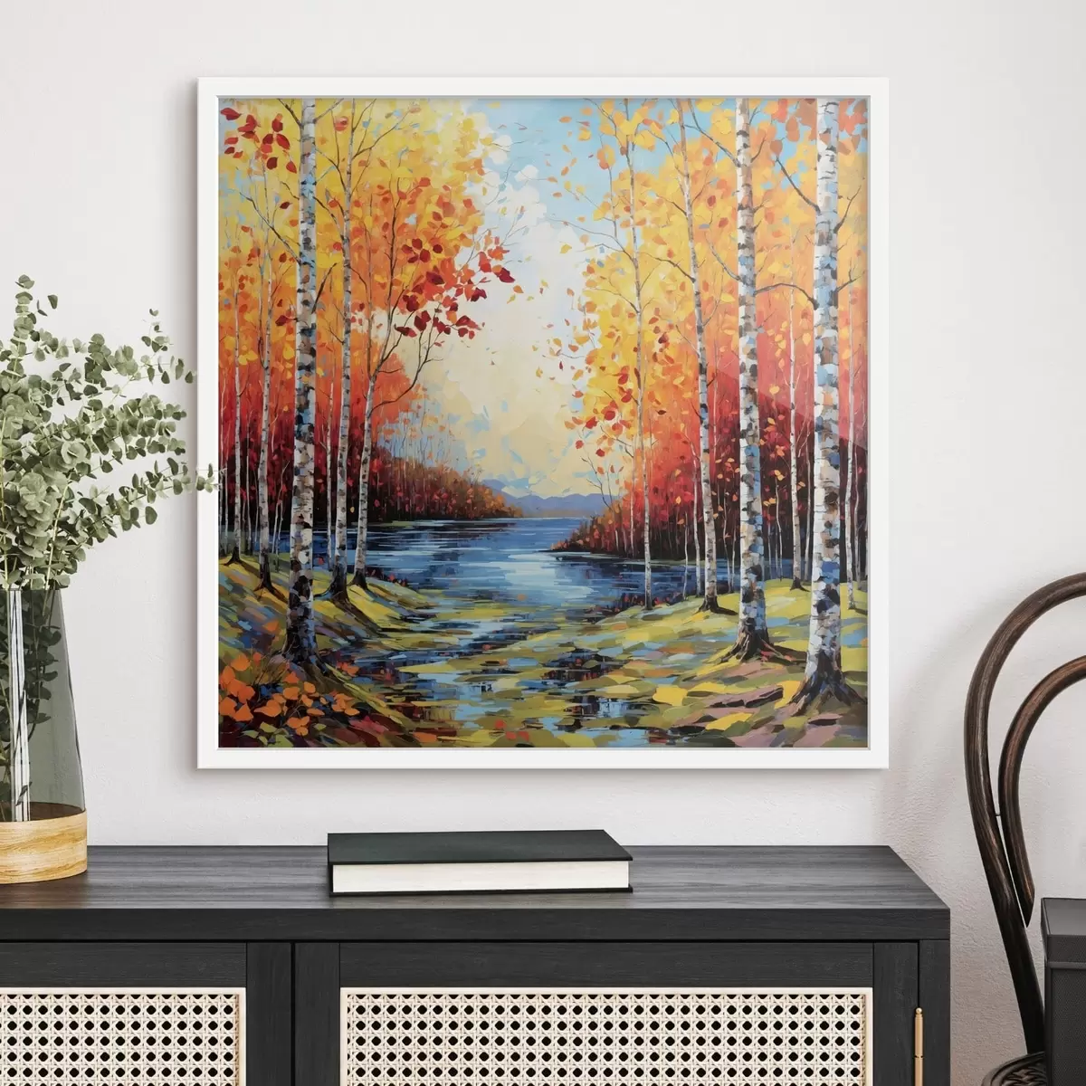Poster Impressionnisme : forêt de bouleaux en automne avec une rivière Nr f48809