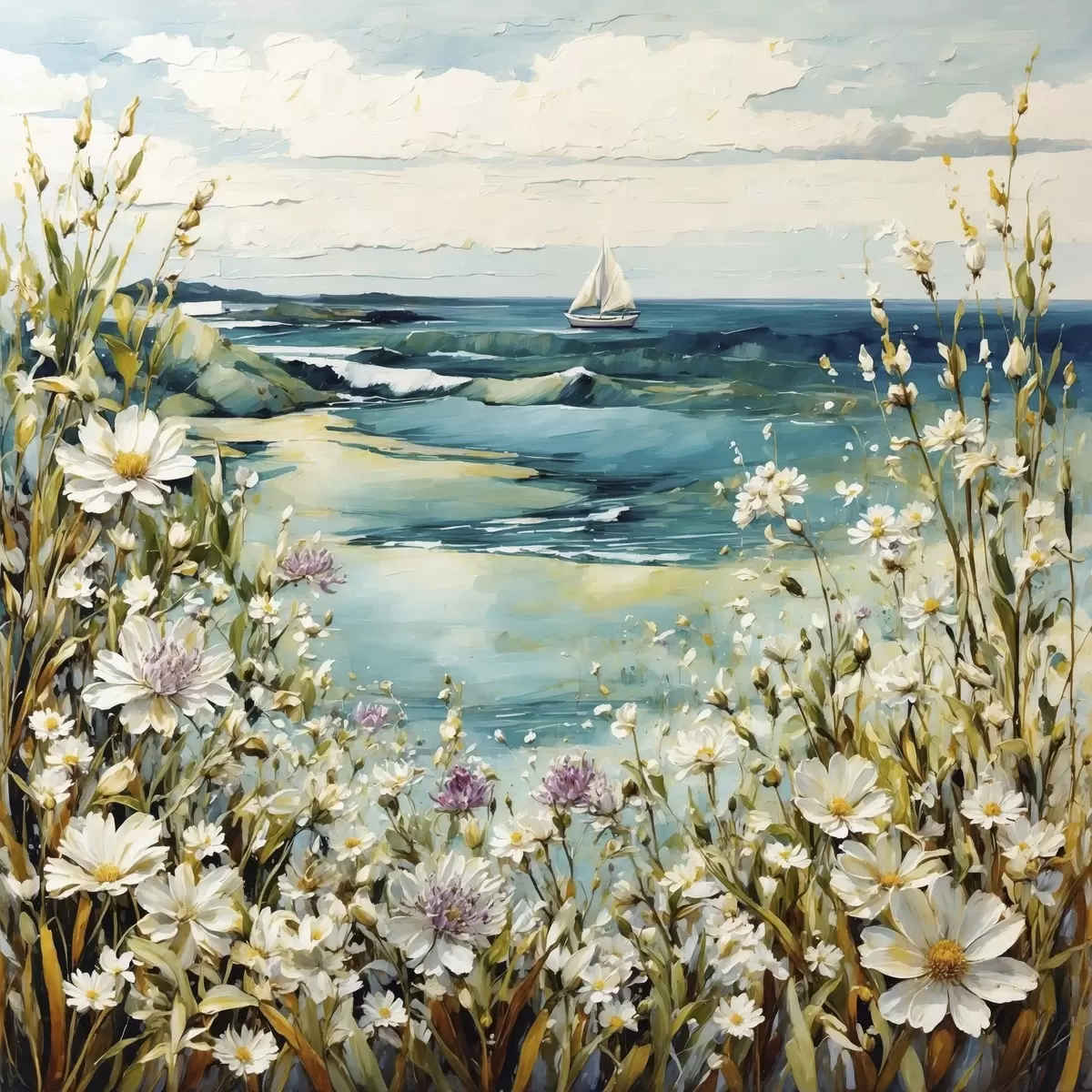 Poster Impressionnisme : bord de mer avec voilier et fleurs f48813