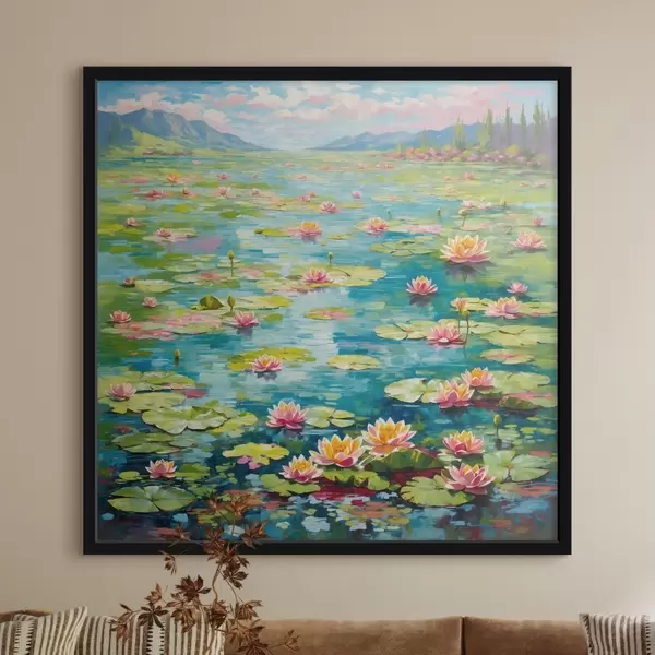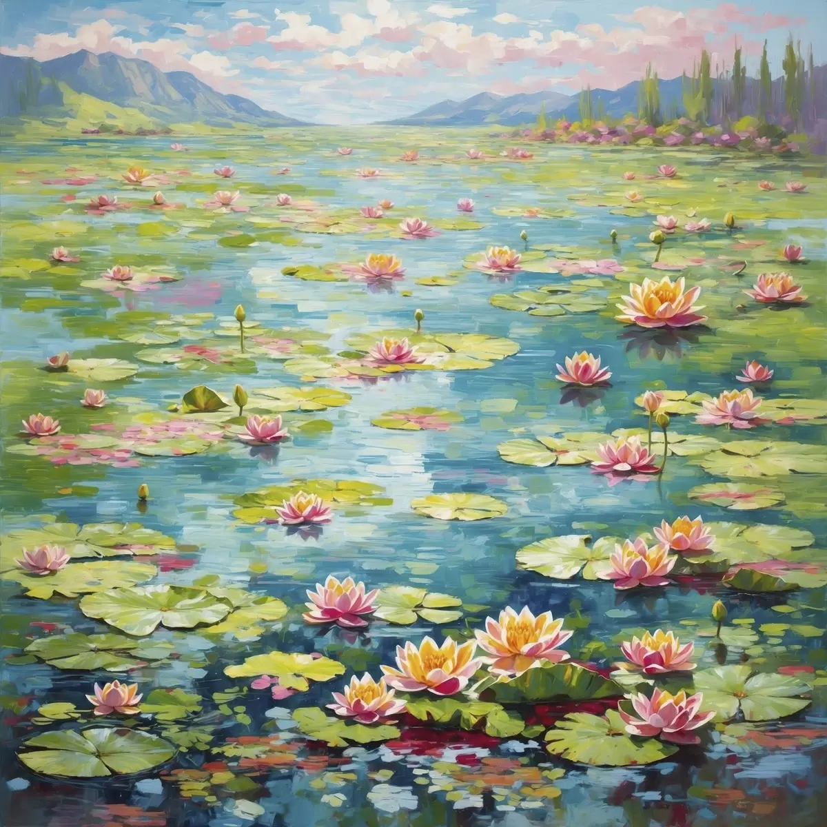 Poster Impressionnisme : l'étang aux nénuphars avec des montagnes au loin f48820