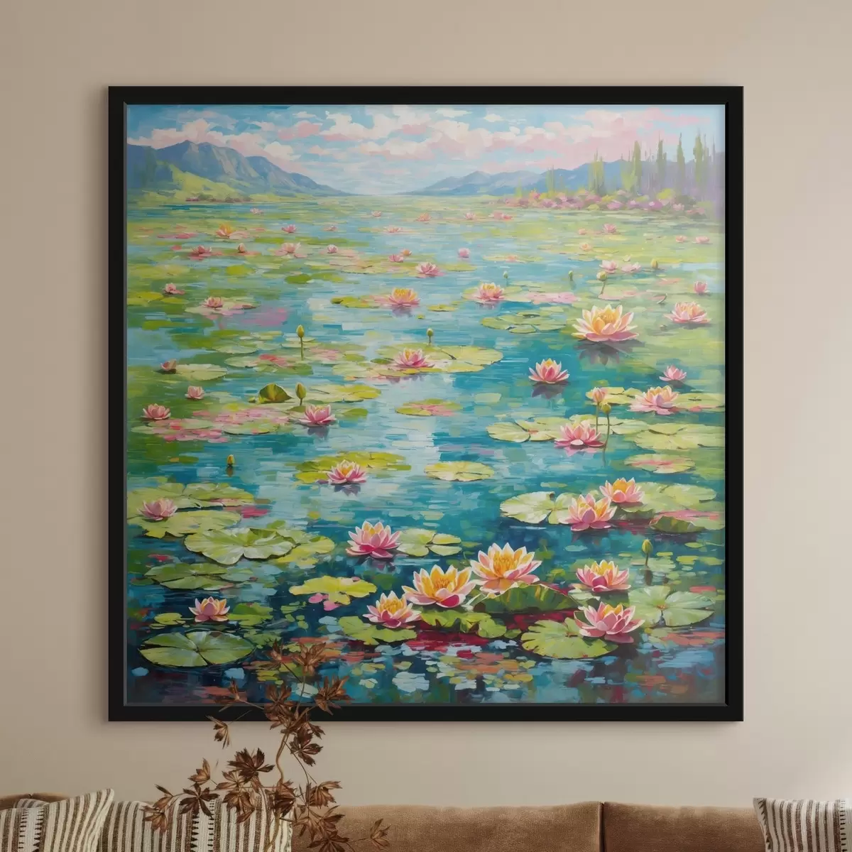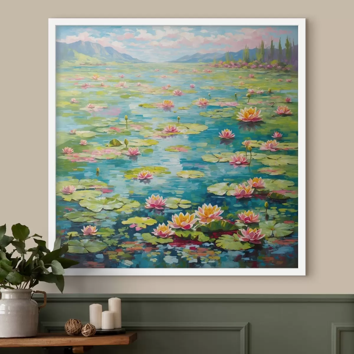 Poster Impressionnisme : l'étang aux nénuphars avec des montagnes au loin Nr f48820